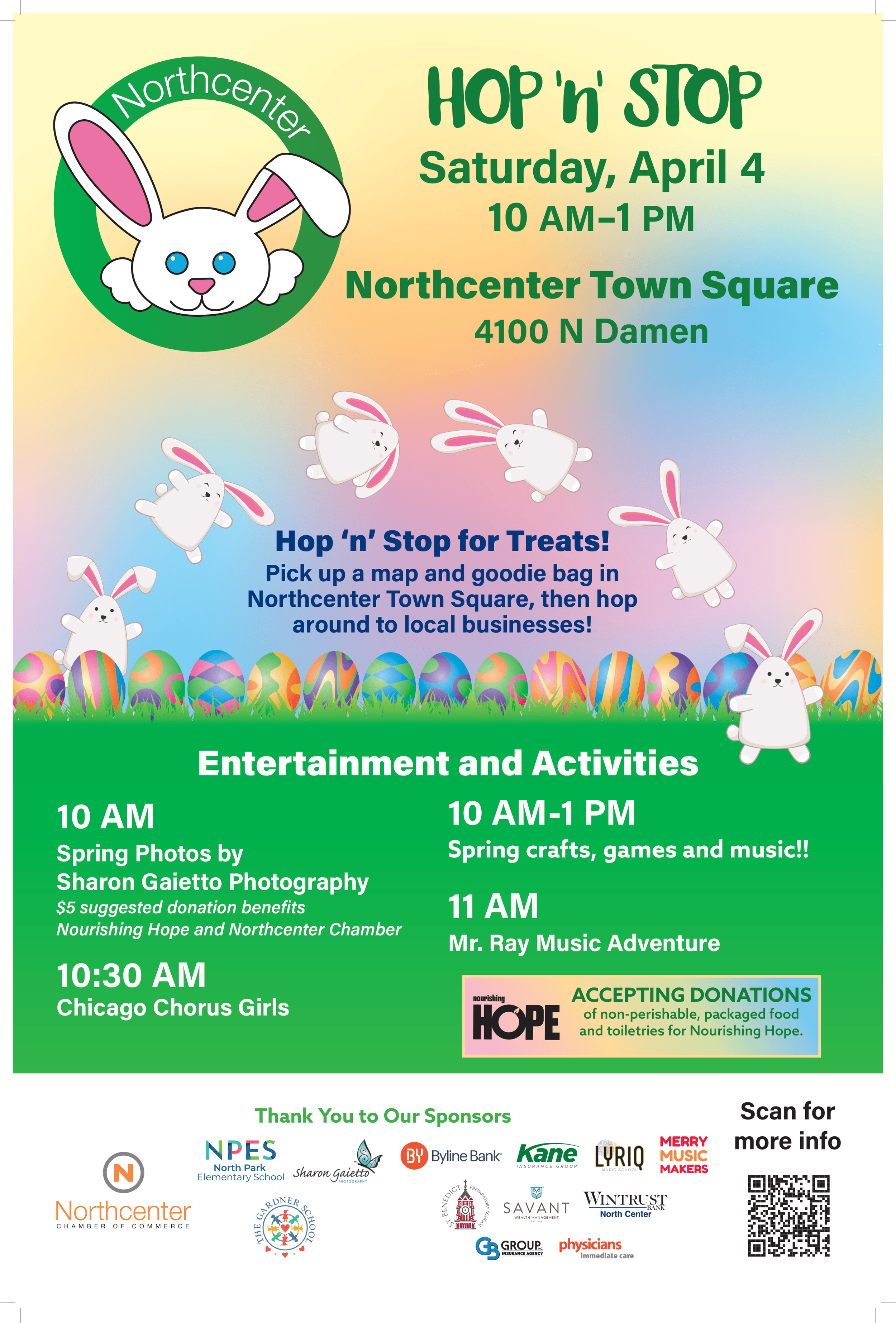 10-11:30am: Spring Photos with the bunny by Sharon Gaietto Photography! $5 suggested donation benefits the Northcenter Chamber & Nourishing Hope.